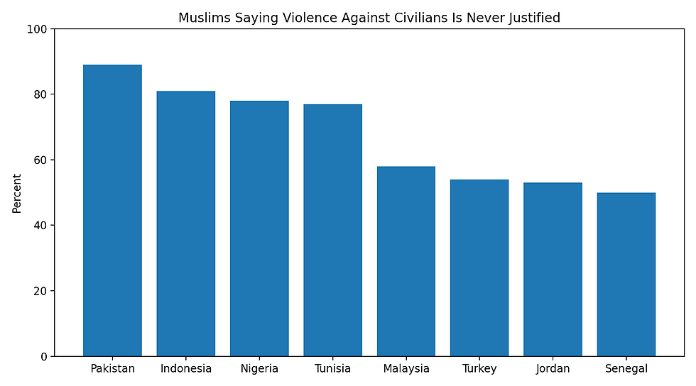 Pew Research found that majorities in many Muslim-majority countries reject violence against civilians: